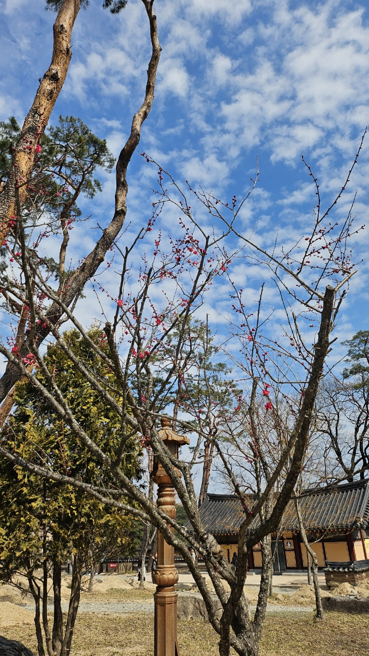 봄을 알리는 홍매화가 수줍게 피어나는 모습과 함께