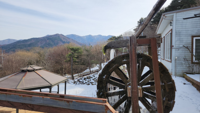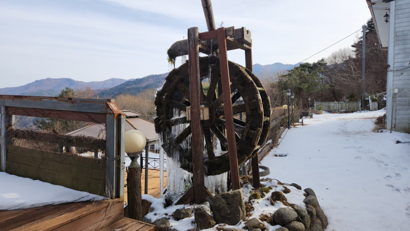 한파로 물레방아는 멈추었지만 물이 만변하는 과정속에서 고드름으로 장엄하며 현현한 그 모습 속에서도 아름답기만 합니다.