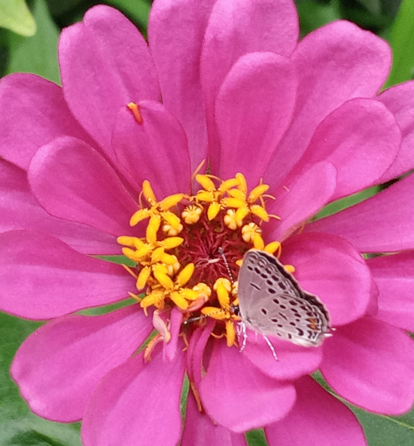 백일홍 꽃잎에 나비 한 마리 앉아있는 예쁜 모습이 눈에 들어와 한컷 찍었습니다.