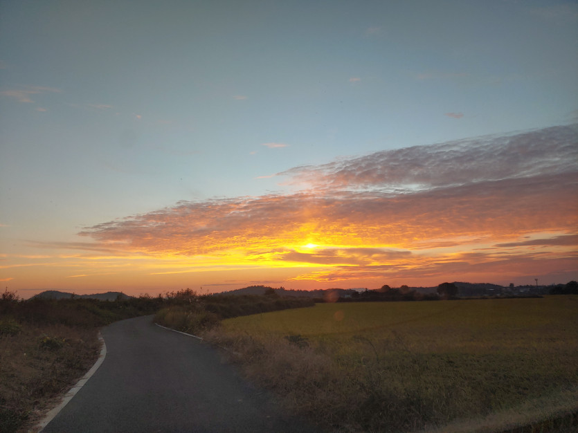 강렬한 황금빛 태양의 모습과 마치 은은한 파스텔톤의 색처럼 아름다운 구름의 모습이 아름답습니다.