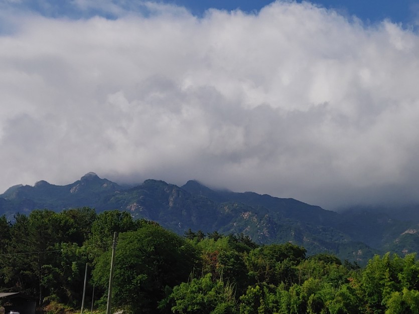 비가 온 뒤에 산이 구름모자를 쓴 듯한 모습인데 제가 부족하여 그 모습을 제대로 닮지 못한 듯하지만 아름다운 모습을장엄하신 초무한참나법신부처님전에 귀감 올리옵니다.