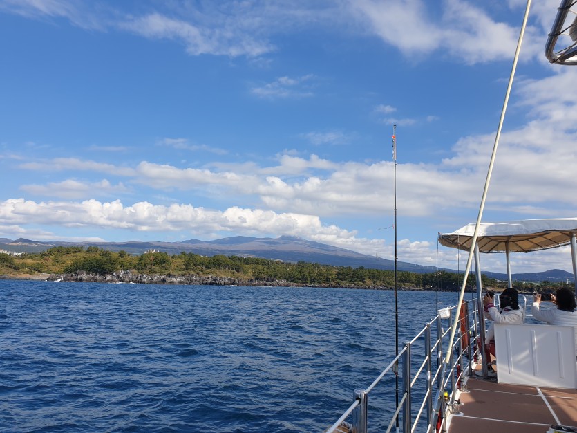 제주도 바다에서 바라본 한라산의 모습입니다.