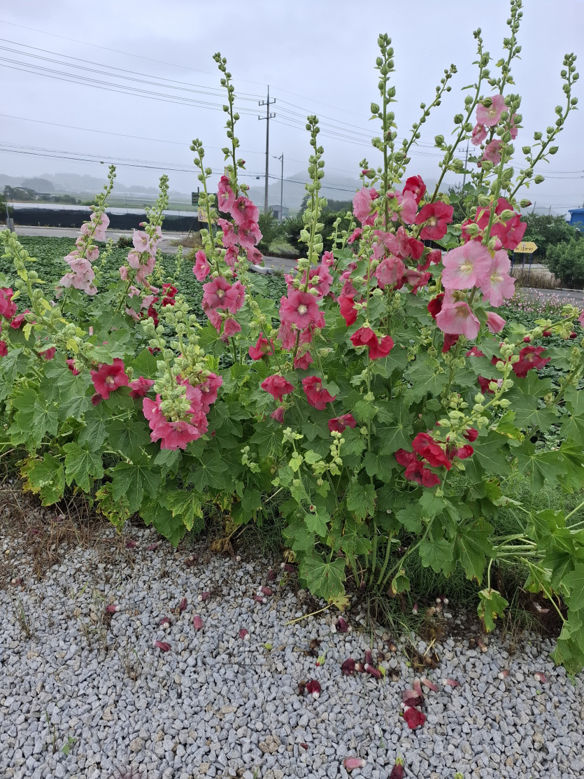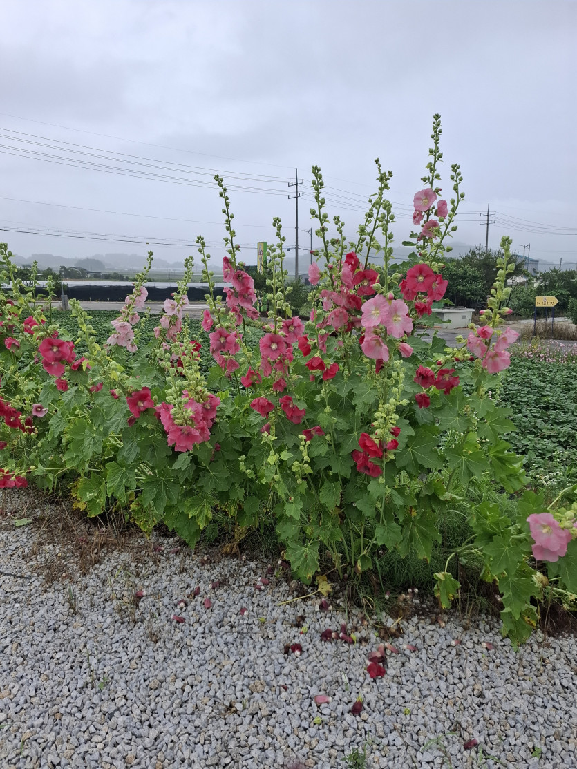 여름날의 들녁에 활작피어 있는 접시꽃을 보면서 이름답게