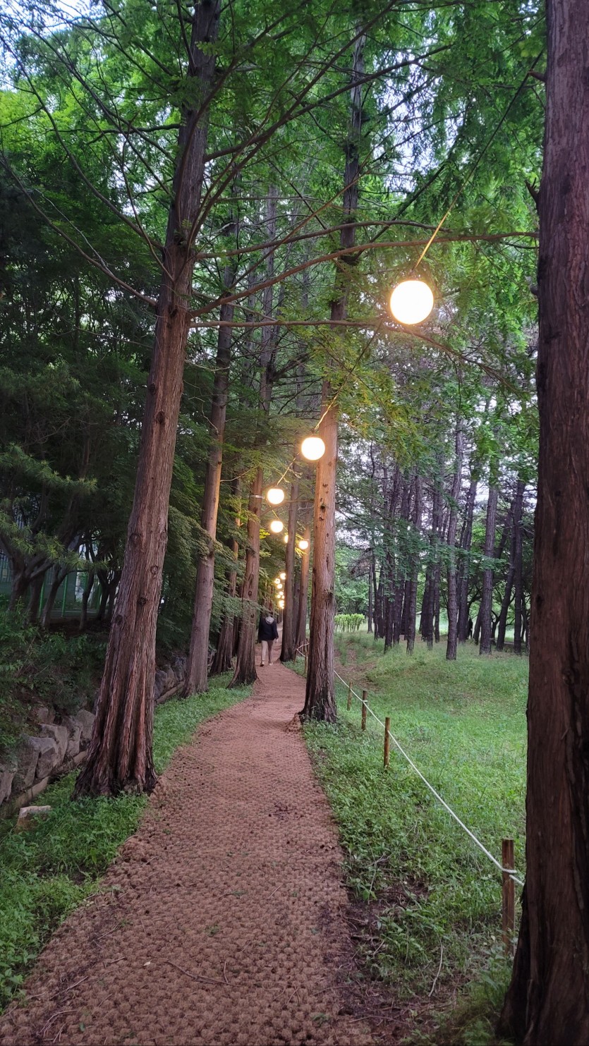 쭉쭉 곧게 잘 자란 나무와 숲을 밝혀주는 가로등불과