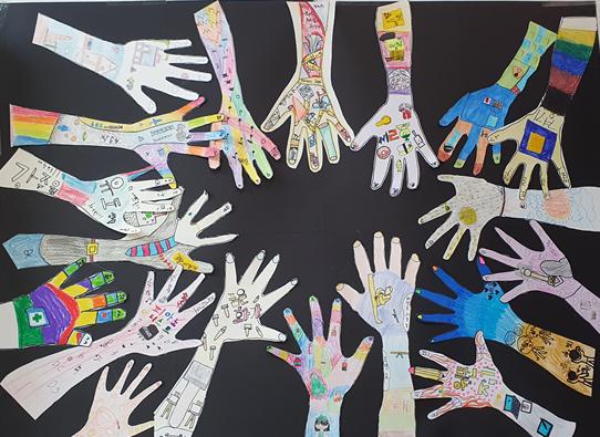 저희반 아이들이 각자의 꿈을 그린 손모양 그림들이 하나로 어우러져