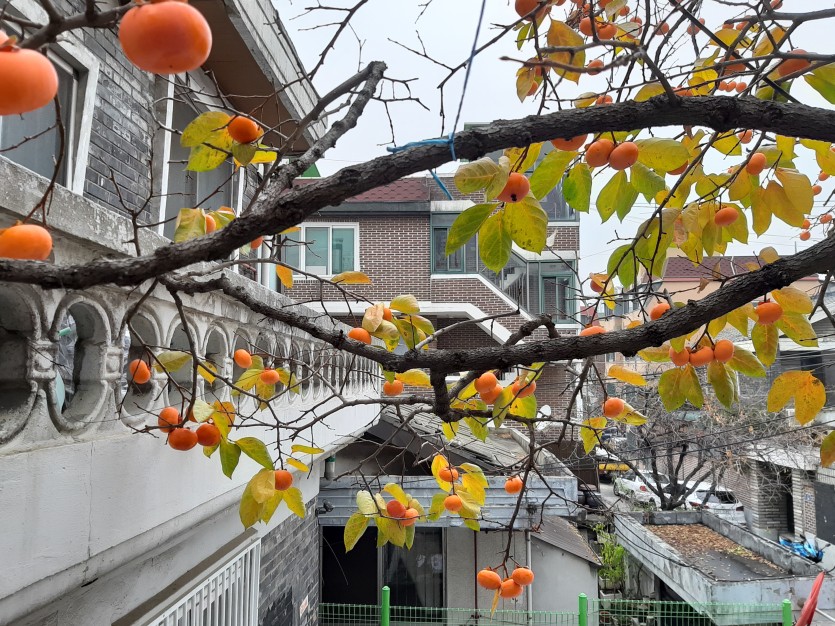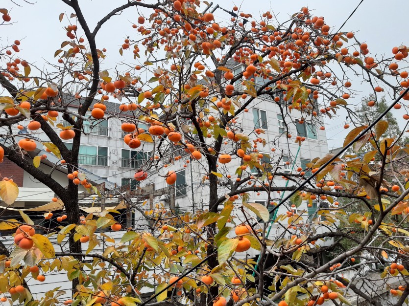 도시 한가운데 주렁주렁 달려있는 홍시가