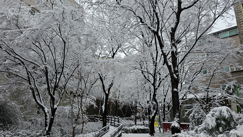 아침에 일어나 창밖을 보니 밤새 내린 눈이