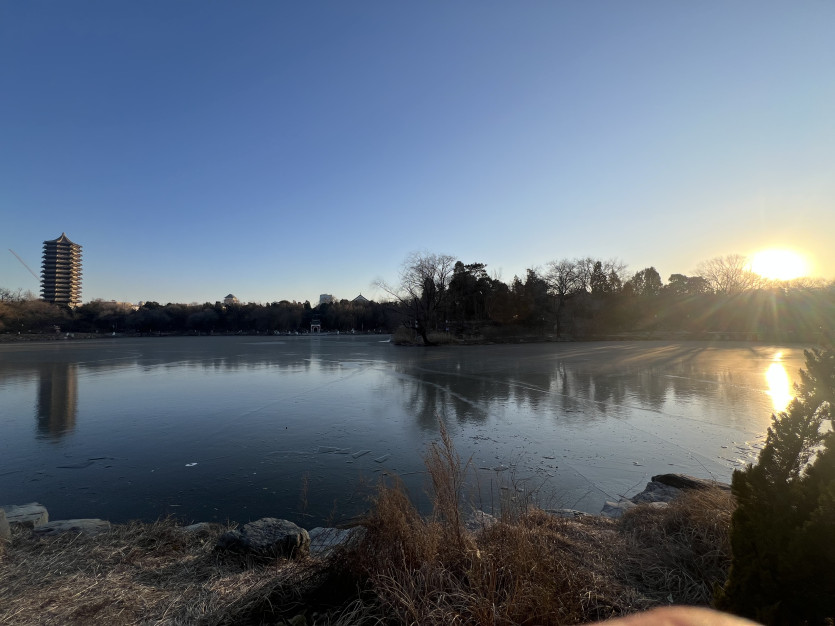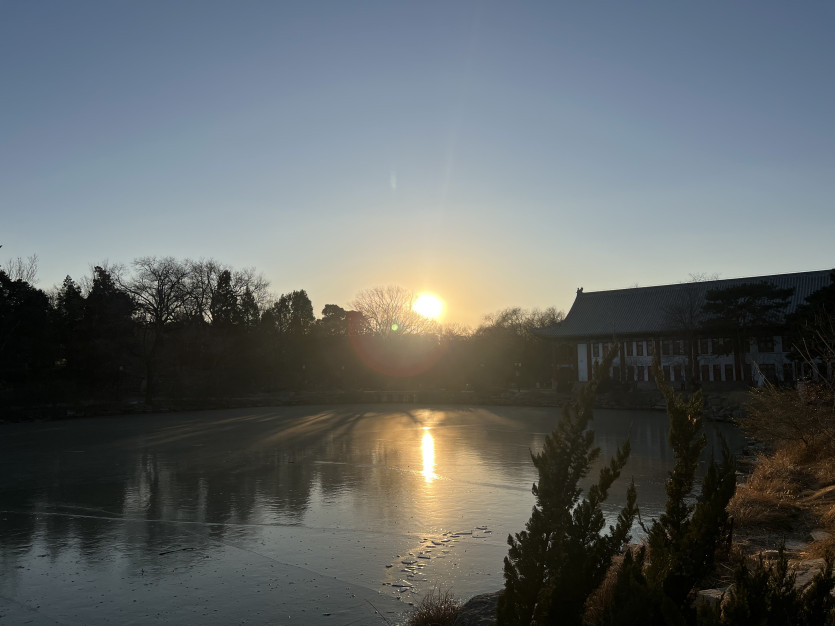 학교 안의 호수가 겨울이 되어 꽝꽝 언 모습입니다.